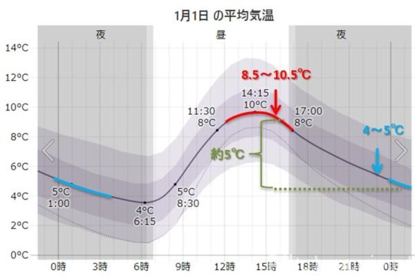 1月1日のデータでシミュレーションしてみると、昼間の気温は8.5~10.5℃、深夜の気温は4~5℃。その差はおよそ5℃程度です。